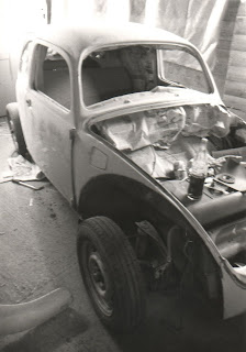 Dann war irgendwann der Lack doch zu unschön. In Onkelchen´s Halle mit dem Wagen, zerlegen (naja, was ich damals als zerlegen verstanden habe) udn dann schleifen, spachteln, schleifen, spachteln, schleifen, spachteln .....