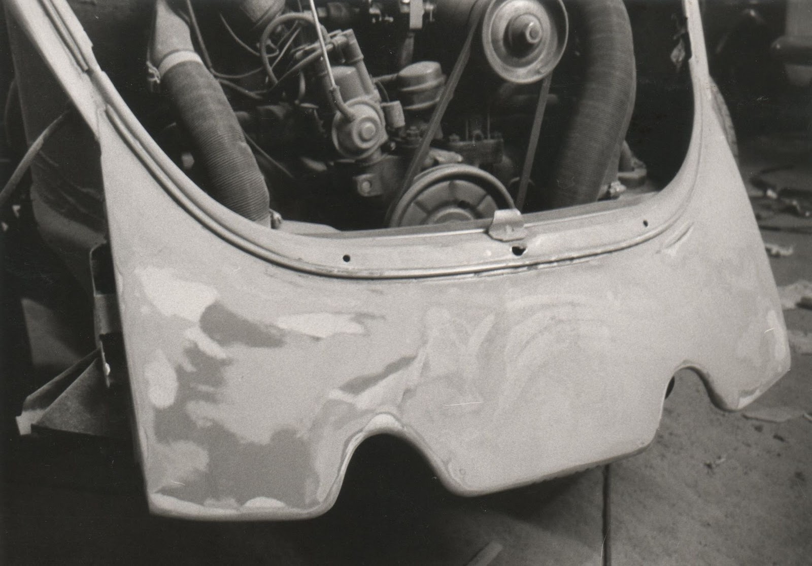 Dann war irgendwann der Lack doch zu unschön. In Onkelchen´s Halle mit dem Wagen, zerlegen (naja, was ich damals als zerlegen verstanden habe) udn dann schleifen, spachteln, schleifen, spachteln, schleifen, spachteln .....