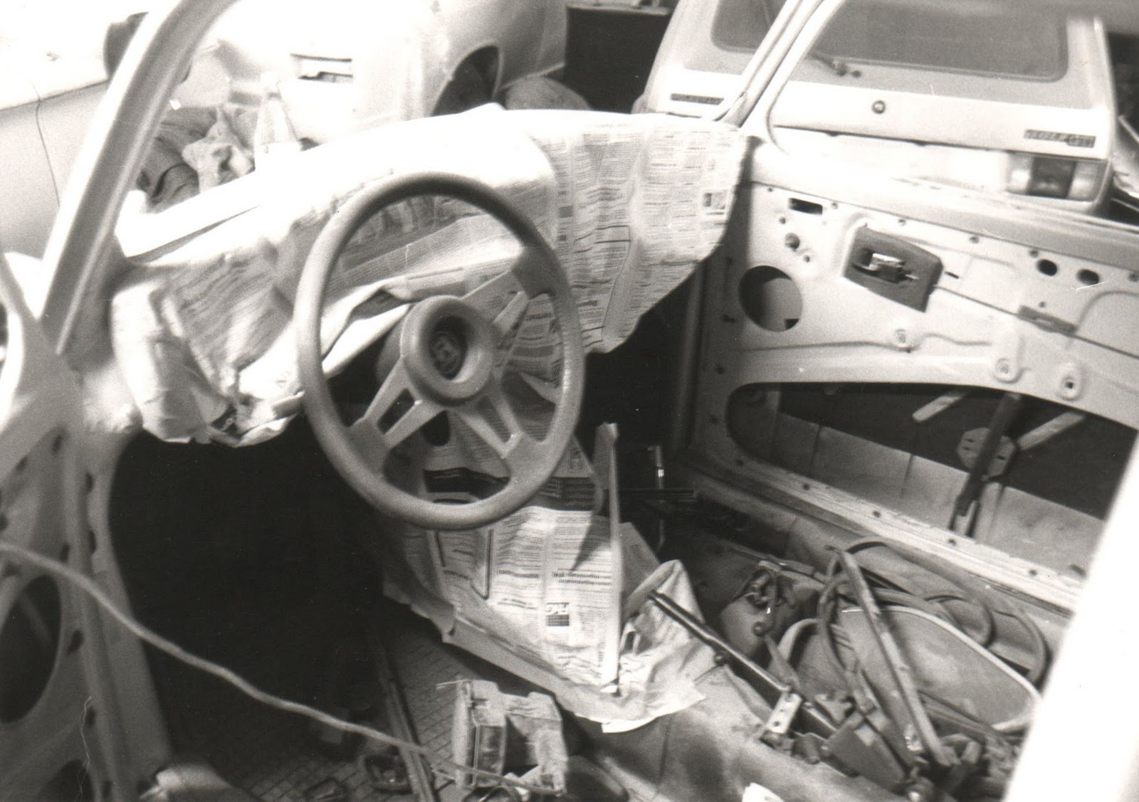 Innen natürlich auch, alles was erreichbar war (ohne den Himmel auszubauen !). Dann gefüllert, gespachtelt, geschliffen, gespachtelt, geschliffen, innen lackiert. Die Außenlackierung hat ein Profi-Lackierer für 300,- Mark erledigt, Material kam von mir. Kardinalsfehler: L97A diamantsilber wurde zu RAL 9005 reinschwarz eingetauscht. War damals cool und in.